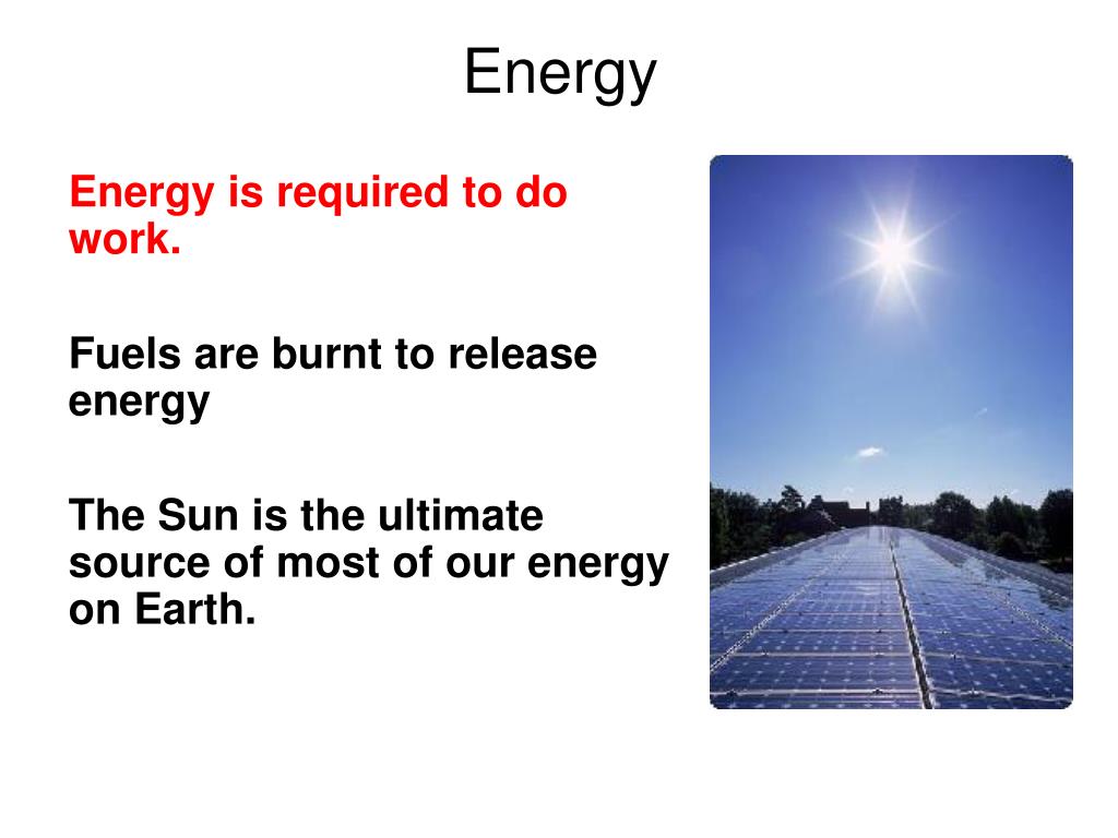 Energy Energy is required to do work. Fuels are burnt to release energy The Sun is the ultimate source of most of our energy on Earth.