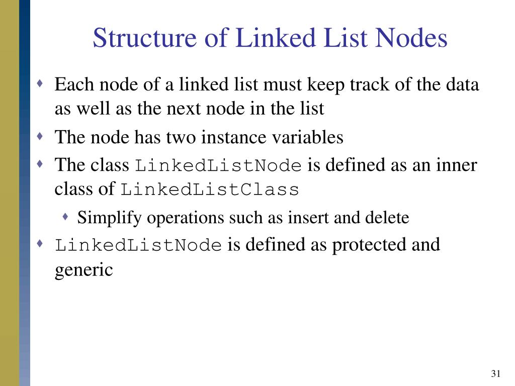 Structure of Linked List Nodes • Each node of a linked list must keep track of the data as well as the next node in the list • The node has two instance variables • The class LinkedListNode is defined as an inner class of LinkedListClass • Simplify operations such as insert and delete • LinkedListNode is defined as protected and generic