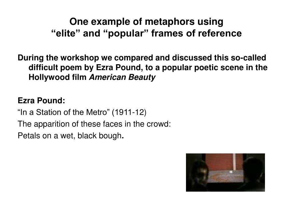 One example of metaphors using “elite” and “popular” frames of reference During the workshop we compared and discussed this so-called difficult poem by Ezra Pound, to a popular poetic scene in the Hollywood film American Beauty Ezra Pound: “In a Station of the Metro” (1911-12) The apparition of these faces in the crowd: Petals on a wet, black bough.