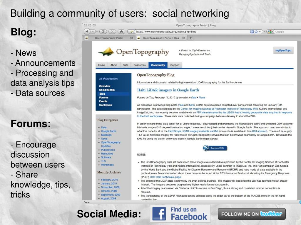 Building a community of users: social networking • Blog: • News • Announcements • Processing and data analysis tips • Data sources • Forums: • Encourage discussion between users • Share knowledge, tips, tricks Social Media: