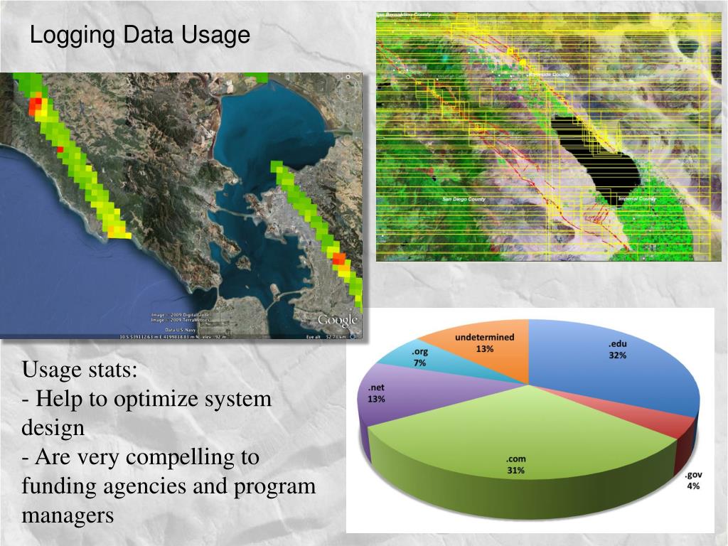 Logging Data Usage • Usage stats: • Help to optimize system design • Are very compelling to funding agencies and program managers