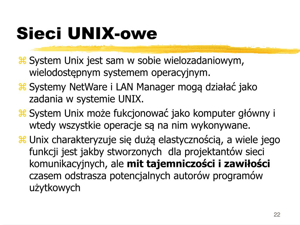 Sieci UNIX-owe • System Unix jest sam w sobie wielozadaniowym, wielodostępnym systemem operacyjnym. • Systemy NetWare i LAN Manager mogą działać jako zadania w systemie UNIX. • System Unix może fukcjonować jako komputer główny i wtedy wszystkie operacje są na nim wykonywane. • Unix charakteryzuje się dużą elastycznością, a wiele jego funkcji jest jakby stworzonych dla projektantów sieci komunikacyjnych, ale mit tajemniczości i zawiłości czasem odstrasza potencjalnych autorów programów użytkowych
