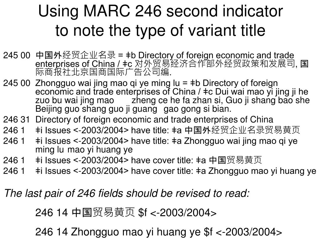 Using MARC 246 second indicatorto note the type of variant title 245 00 中国外经贸企业名录 = ǂb Directory of foreign economic and trade enterprises of China / ǂc 对外贸易经济合作部外经贸政策和发展司, 国 际商报社北京国商国际广告公司编. 245 00 Zhongguo wai jing mao qi ye ming lu = ǂb Directory of foreign economic and trade enterprises of China / ǂc Dui wai mao yi jing ji he zuo bu wai jing mao zheng ce he fa zhan si, Guo ji shang bao she Beijing guo shang guo ji guang gao gong si bian. 246 31 Directory of foreign economic and trade enterprises of China 246 1 ǂi Issues <-2003/2004> have title: ǂa 中国外经贸企业名录贸易黄页 246 1 ǂi Issues <-2003/2004> have title: ǂa Zhongguo wai jing mao qi ye ming lu mao yi huang ye 246 1 ǂi Issues <-2003/2004> have cover title: ǂa 中国贸易黄页 246 1 ǂi Issues <-2003/2004> have cover title: ǂa Zhongguo mao yi huang ye The last pair of 246 fields should be revised to read: 246 14 中国贸易黄页 $f <-2003/2004> 246 14 Zhongguo mao yi huang ye $f <-2003/2004>
