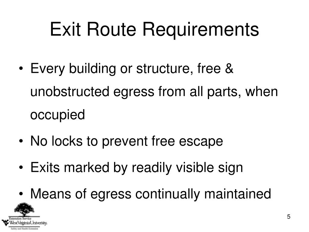 Exit Route Requirements • Every building or structure, free & unobstructed egress from all parts, when occupied • No locks to prevent free escape • Exits marked by readily visible sign • Means of egress continually maintained