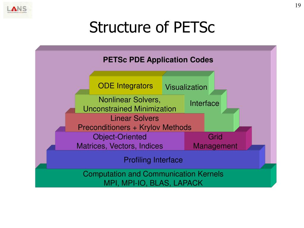 PETSc PDE Application Codes ODE Integrators Visualization Nonlinear Solvers, Unconstrained Minimization Interface Linear Solvers Preconditioners + Krylov Methods Object-Oriented Matrices, Vectors, Indices Grid Management Profiling Interface Computation and Communication Kernels MPI, MPI-IO, BLAS, LAPACK Structure of PETSc