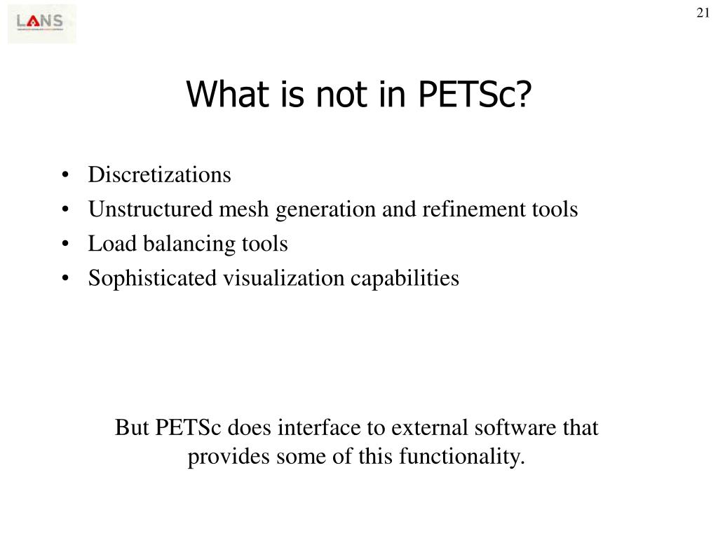 What is not in PETSc? • Discretizations • Unstructured mesh generation and refinement tools • Load balancing tools • Sophisticated visualization capabilities But PETSc does interface to external software that provides some of this functionality.