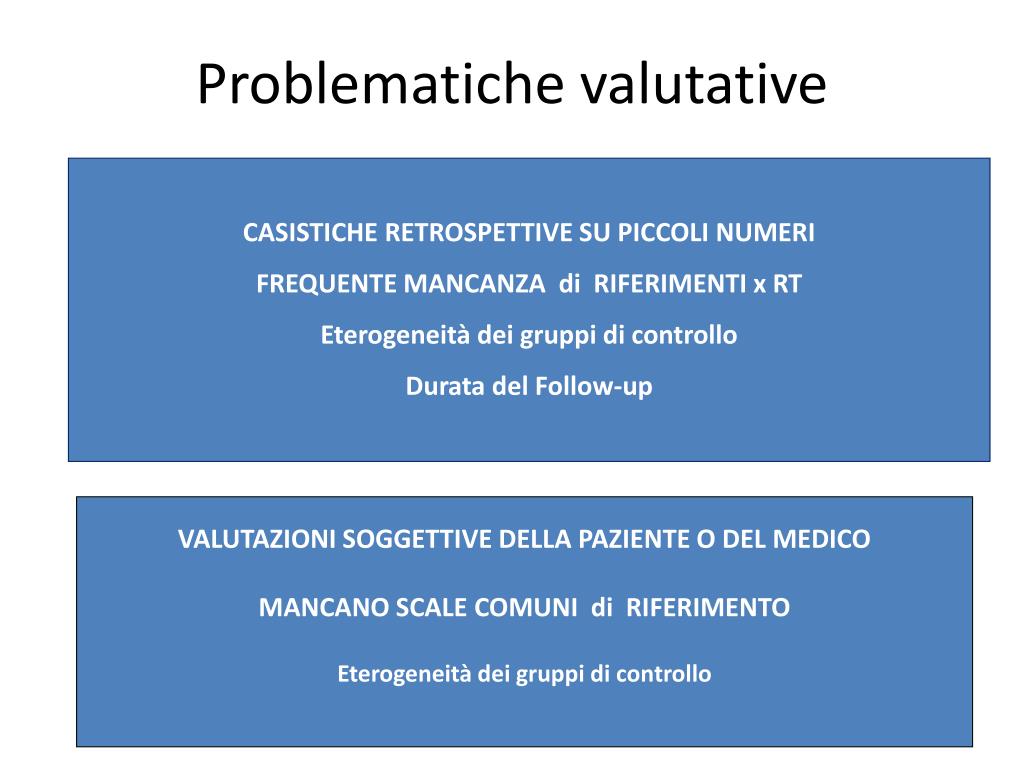 Problematiche valutative VALUTAZIONI SOGGETTIVE DELLA PAZIENTE O DEL MEDICO MANCANO SCALE COMUNI di RIFERIMENTO Eterogeneità dei gruppi di controllo CASISTICHE RETROSPETTIVE SU PICCOLI NUMERI FREQUENTE MANCANZA di RIFERIMENTI x RT Eterogeneità dei gruppi di controllo Durata del Follow-up