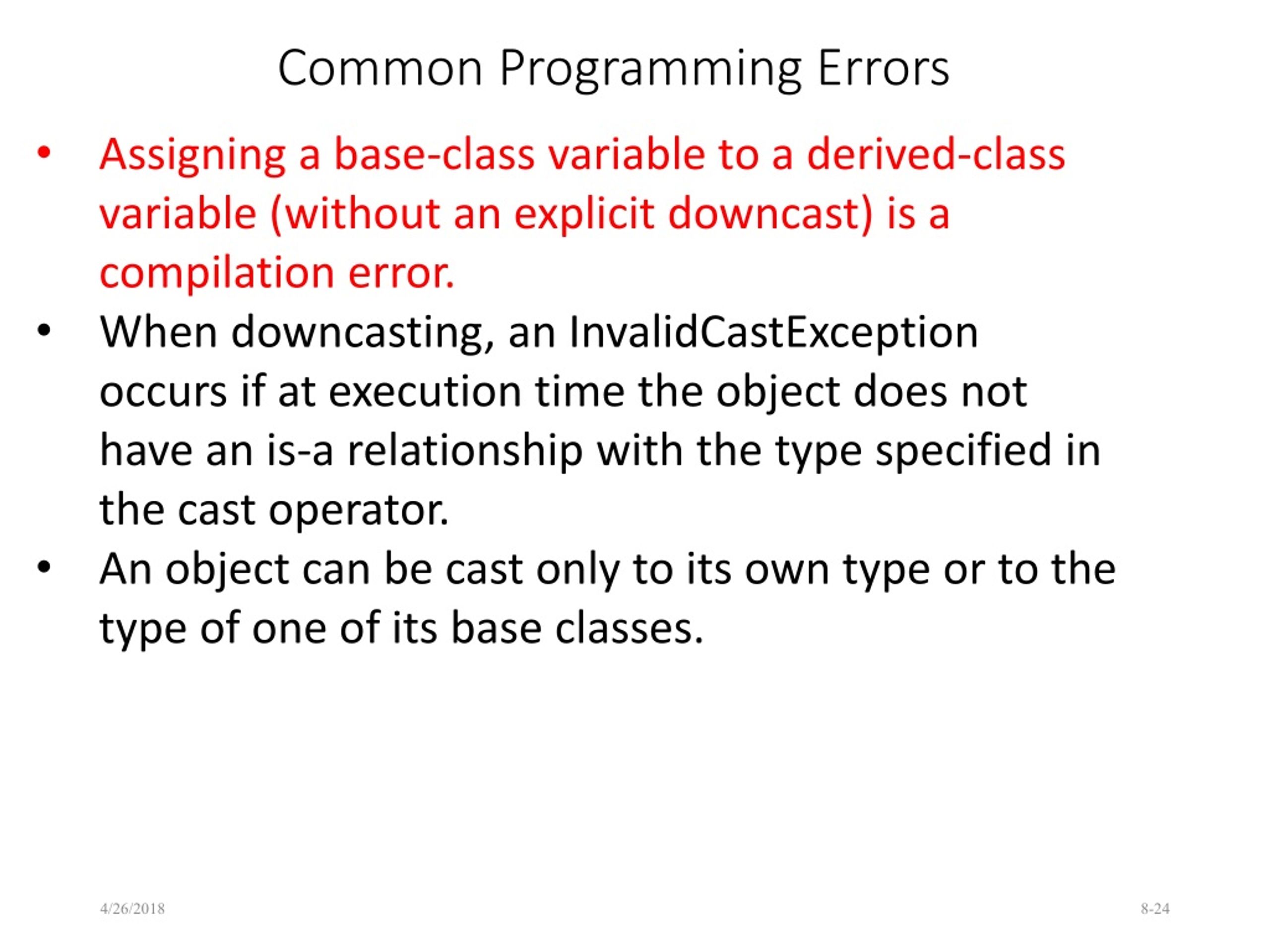 Assigning a base-class variable to a derived-class variable (without an explicit downcast) is a compilation error. • When downcasting, an InvalidCastException occurs if at execution time the object does not have an is-a relationship with the type specified in the cast operator. • An object can be cast only to its own type or to the type of one of its base classes. Common Programming Errors
