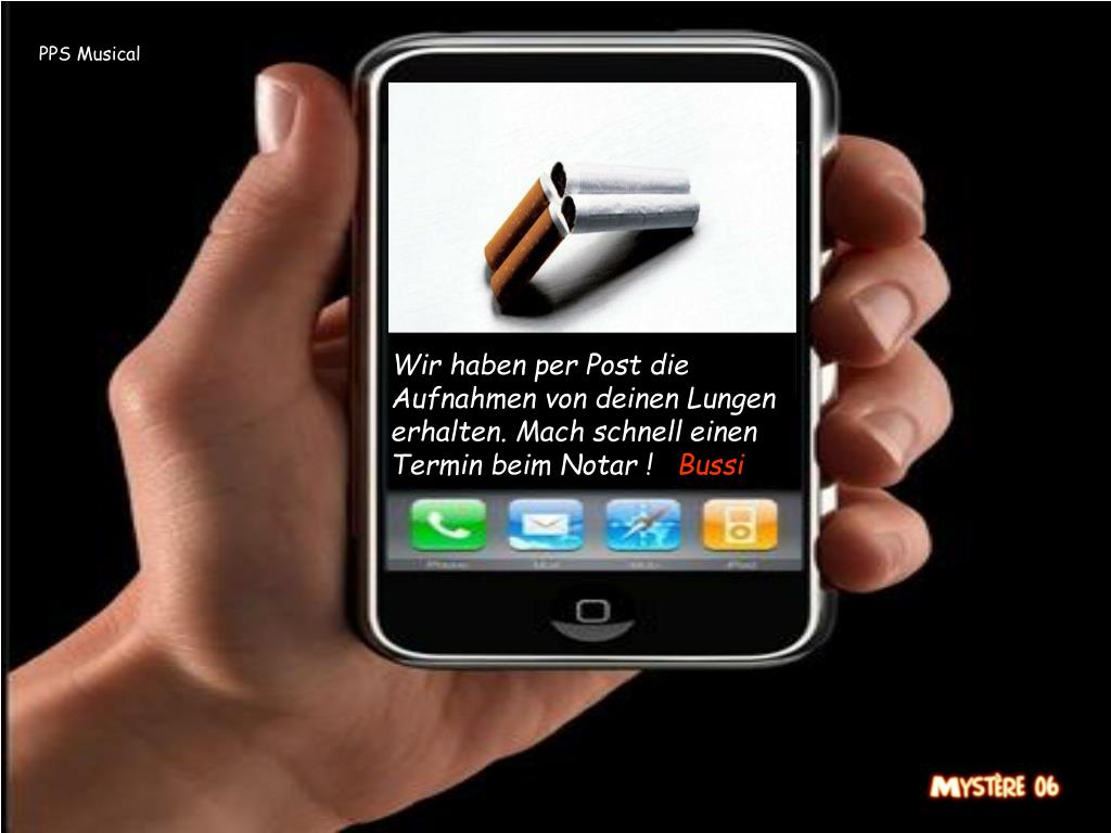 Die MMS. Du klickst nach jeder Seite. PPS Musical. PPS Musical. Ich lass’ dir 10 min um nach Hause zu kommen. Sonst wird es schlimm werden !. PPS Musical. Vergiss Omas Geburtstag nicht ! Es ist vielleicht der letzte !. PPS Musical.