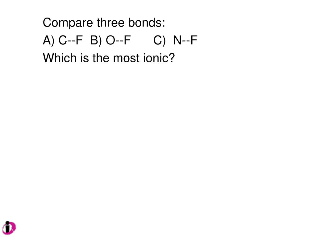 Compare three bonds: A) C--F B) O--F C) N--F Which is the most ionic?