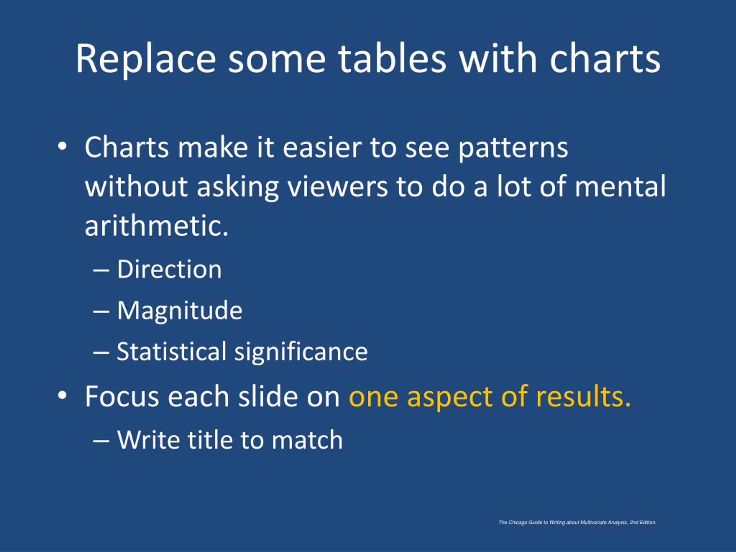 Replace some tables with charts • Charts make it easier to see patterns without asking viewers to do a lot of mental arithmetic. • Direction • Magnitude • Statistical significance • Focus each slide on one aspect of results. • Write title to match