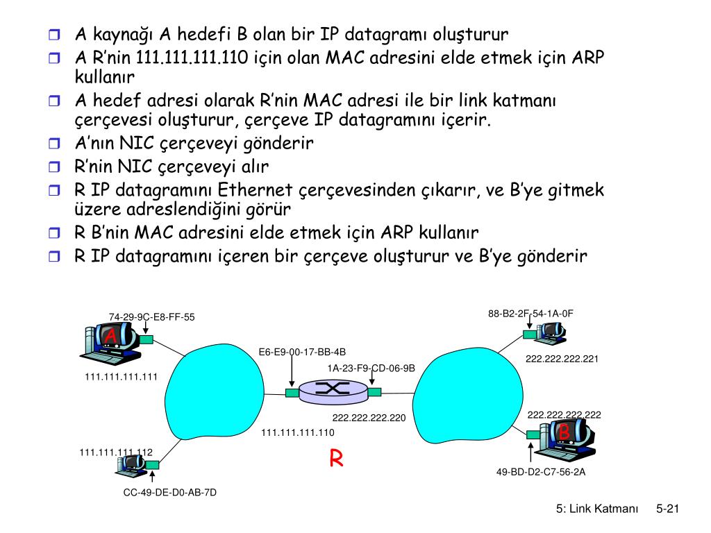 88-B2-2F-54-1A-0F 74-29-9C-E8-FF-55 E6-E9-00-17-BB-4B 222.222.222.221 1A-23-F9-CD-06-9B 111.111.111.111 222.222.222.222 222.222.222.220 111.111.111.110 R 111.111.111.112 49-BD-D2-C7-56-2A CC-49-DE-D0-AB-7D A B Adresleme: diğer LAN’e yönlendirme A’dan B’ye R aracılığıyla datagram gönderelim A’nın B’nin IP adresini bildiğini kabul edelim • yönlendirici R’de iki tane ARP tablosu var.Her iki LAN için birer tane 5: Link Katmanı