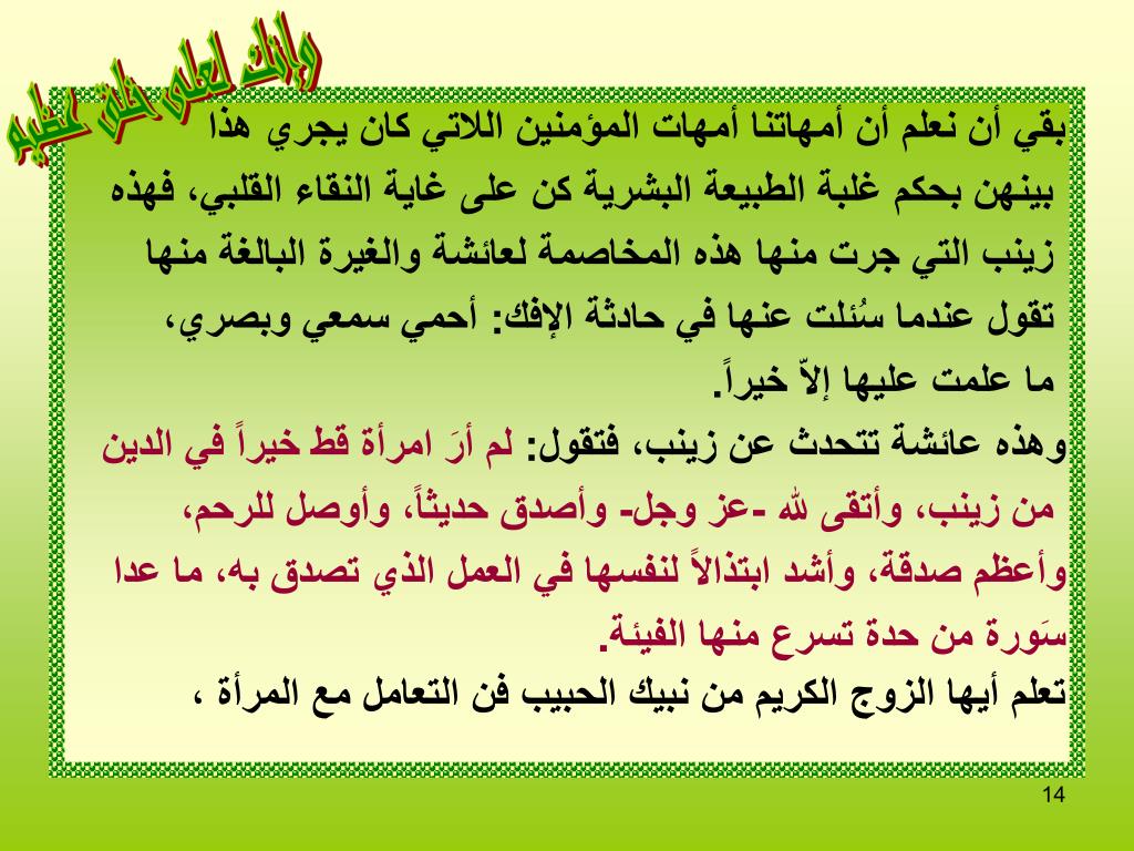 وإنك لعلى خلق عظيم بقي أن نعلم أن أمهاتنا أمهات المؤمنين اللاتي كان يجريهذا بينهن بحكم غلبة الطبيعة البشرية كن على غاية النقاء القلبي، فهذه زينب التي جرت منها هذه المخاصمة لعائشة والغيرة البالغةمنها تقول عندما سُئلت عنها في حادثة الإفك: أحمي سمعي وبصري، ما علمت عليها إلاّ خيراً. وهذه عائشة تتحدث عن زينب، فتقول: لم أرَ امرأة قط خيراً في الدين من زينب، وأتقى لله -عز وجل- وأصدق حديثاً، وأوصل للرحم، وأعظم صدقة، وأشد ابتذالاً لنفسها في العمل الذي تصدق به،ما عدا سَورة من حدة تسرع منها الفيئة. تعلم أيها الزوج الكريم من نبيك الحبيب فن التعامل مع المرأة،