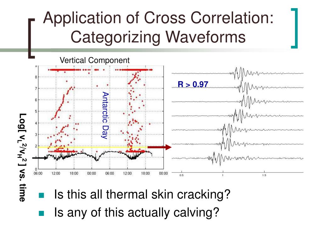 Application of Cross Correlation: Categorizing Waveforms Vertical Component R > 0.97 Antarctic Day Antarctic Day • Is this all thermal skin cracking? • Is any of this actually calving? Log[ vL2/vH2 ] vs. time