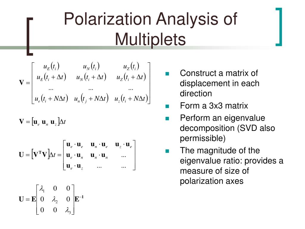 Polarization Analysis of Multiplets • Construct a matrix of displacement in each direction • Form a 3x3 matrix • Perform an eigenvalue decomposition (SVD also permissible) • The magnitude of the eigenvalue ratio: provides a measure of size of polarization axes