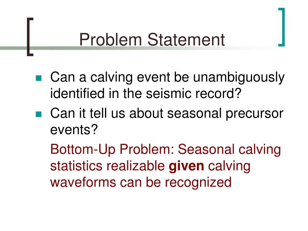 Problem Statement • Can a calving event be unambiguously identified in the seismic record? • Can it tell us about seasonal precursor events? Bottom-Up Problem: Seasonal calving statistics realizable givencalving waveforms can be recognized