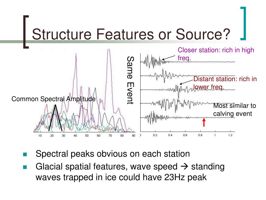 Structure Features or Source? Closer station: rich in high freq. Distant station: rich in lower freq. Same Event Common Spectral Amplitude Most similar to calving event • Spectral peaks obvious on each station • Glacial spatial features, wave speed standing waves trapped in ice could have 23Hz peak