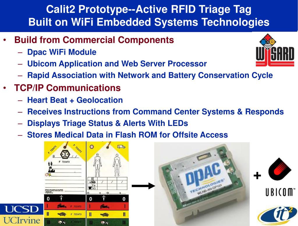 Calit2 Prototype--Active RFID Triage Tag Built on WiFi Embedded Systems Technologies Build from Commercial Components Dpac WiFi Module Ubicom Application and Web Server Processor Rapid Association with Network and Battery Conservation Cycle TCP/IP Communications Heart Beat + Geolocation Receives Instructions from Command Center Systems & Responds Displays Triage Status & Alerts With LEDs Stores Medical Data in Flash ROM for Offsite Access +
