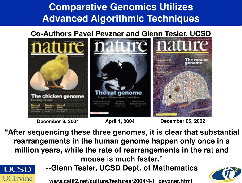 Comparative Genomics Utilizes Advanced Algorithmic Techniques Co-Authors Pavel Pevzner and Glenn Tesler, UCSD December 05, 2002 April 1, 2004 December 9, 2004 “After sequencing these three genomes, it is clear that substantial rearrangements in the human genome happen only once in a million years, while the rate of rearrangements in the rat and mouse is much faster.” --Glenn Tesler, UCSD Dept. of Mathematics www.calit2.net/culture/features/2004/4-1_pevzner.html
