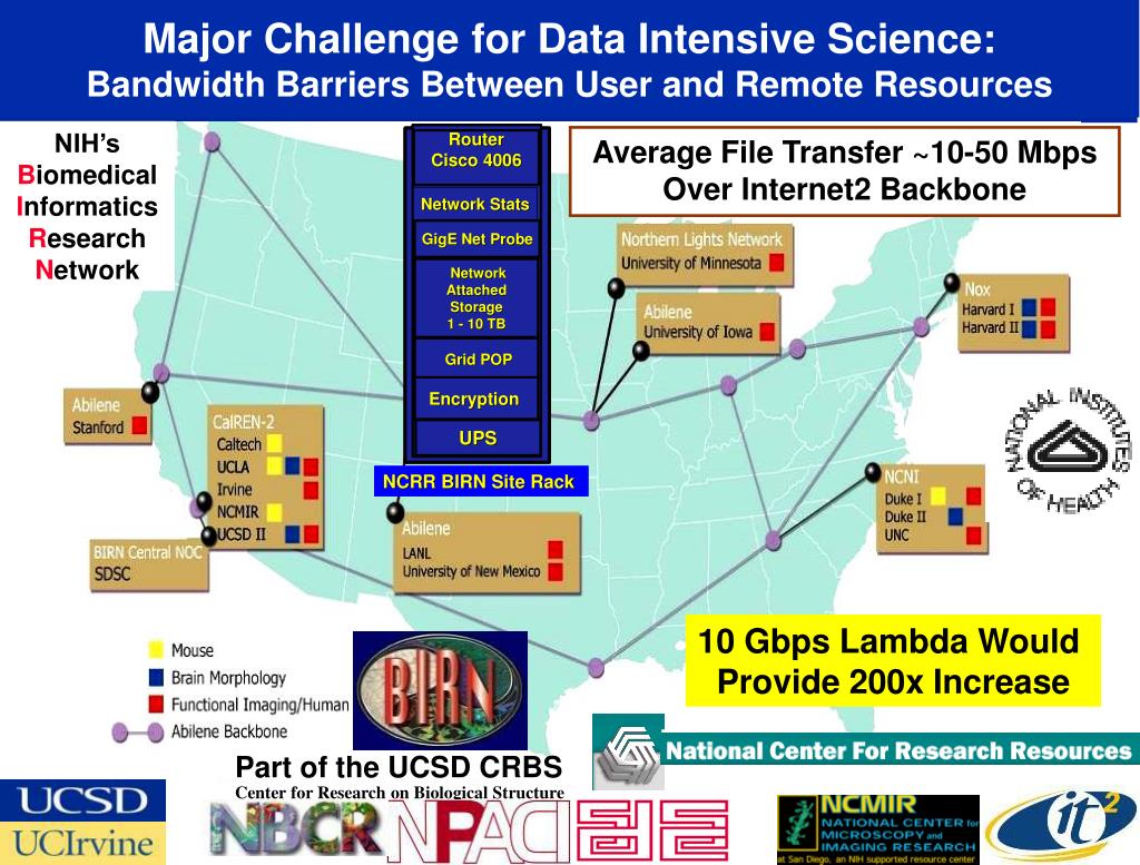 Major Challenge for Data Intensive Science: Bandwidth Barriers Between User and Remote Resources NIH’s Biomedical Informatics Research Network Average File Transfer ~10-50 Mbps Over Internet2 Backbone 10 Gbps Lambda Would Provide 200x Increase Part of the UCSD CRBSCenter for Research on Biological Structure National Partnership for Advanced Computational Infrastructure