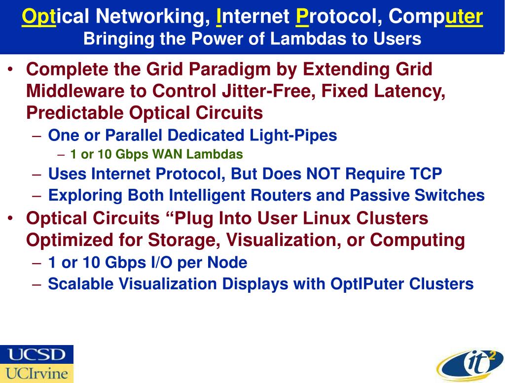 Optical Networking, Internet Protocol, ComputerBringing the Power of Lambdas to Users • Complete the Grid Paradigm by Extending Grid Middleware to Control Jitter-Free, Fixed Latency, Predictable Optical Circuits • One or Parallel Dedicated Light-Pipes • 1 or 10 Gbps WAN Lambdas • Uses Internet Protocol, But Does NOT Require TCP • Exploring Both Intelligent Routers and Passive Switches • Optical Circuits “Plug Into User Linux Clusters Optimized for Storage, Visualization, or Computing • 1 or 10 Gbps I/O per Node • Scalable Visualization Displays with OptIPuter Clusters