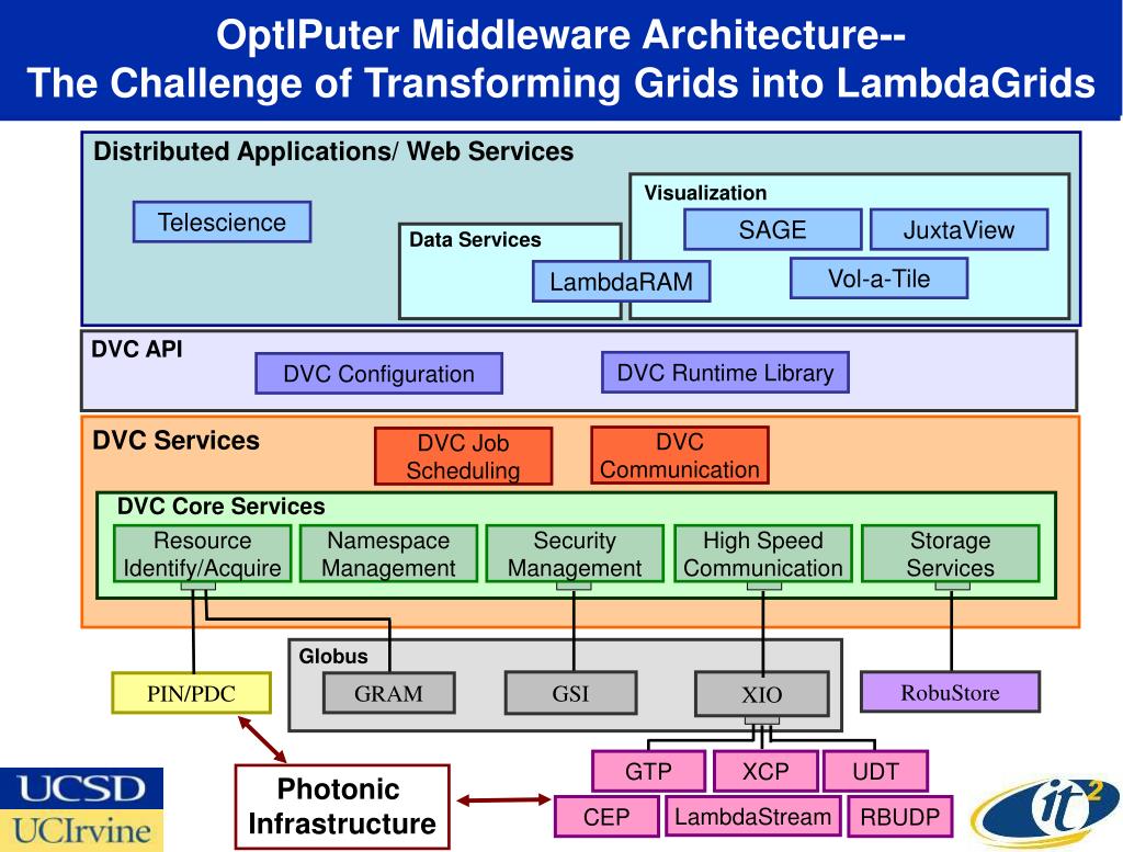 OptIPuter Middleware Architecture-- The Challenge of Transforming Grids into LambdaGrids DVC API DVC Runtime Library DVC Configuration DVC Services DVC Communication DVC Job Scheduling DVC Core Services Resource Identify/Acquire Namespace Management Security Management High Speed Communication Storage Services Globus XIO GSI RobuStore GRAM GTP XCP UDT CEP LambdaStream RBUDP Distributed Applications/ Web Services Visualization Telescience SAGE JuxtaView Data Services Vol-a-Tile LambdaRAM PIN/PDC Photonic Infrastructure