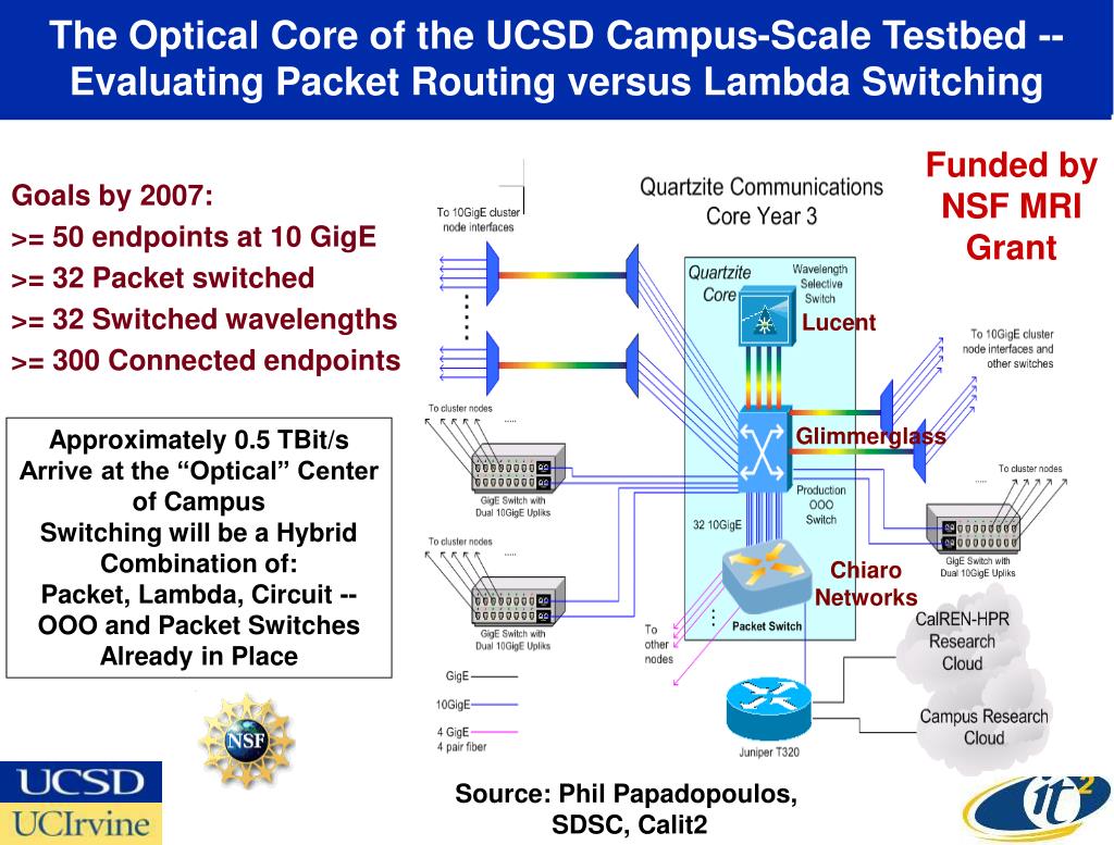 The Optical Core of the UCSD Campus-Scale Testbed --Evaluating Packet Routing versus Lambda Switching Goals by 2007: >= 50 endpoints at 10 GigE >= 32 Packet switched >= 32 Switched wavelengths >= 300 Connected endpoints Funded by NSF MRI Grant Lucent Glimmerglass Approximately 0.5 TBit/s Arrive at the “Optical” Center of Campus Switching will be a Hybrid Combination of: Packet, Lambda, Circuit -- OOO and Packet Switches Already in Place Chiaro Networks Source: Phil Papadopoulos, SDSC, Calit2