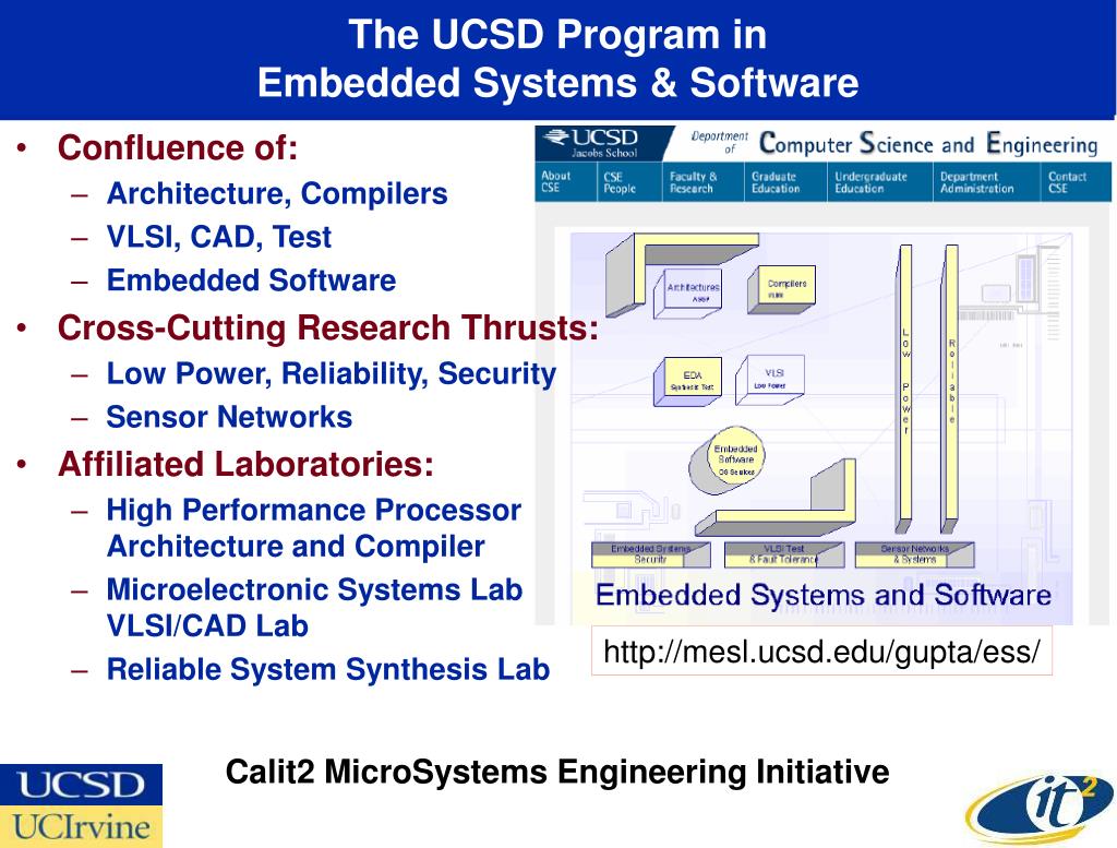 The UCSD Program in Embedded Systems & Software • Confluence of: • Architecture, Compilers • VLSI, CAD, Test • Embedded Software • Cross-Cutting Research Thrusts: • Low Power, Reliability, Security • Sensor Networks • Affiliated Laboratories: • High Performance Processor Architecture and Compiler • Microelectronic Systems Lab VLSI/CAD Lab • Reliable System Synthesis Lab http://mesl.ucsd.edu/gupta/ess/ Calit2 MicroSystems Engineering Initiative
