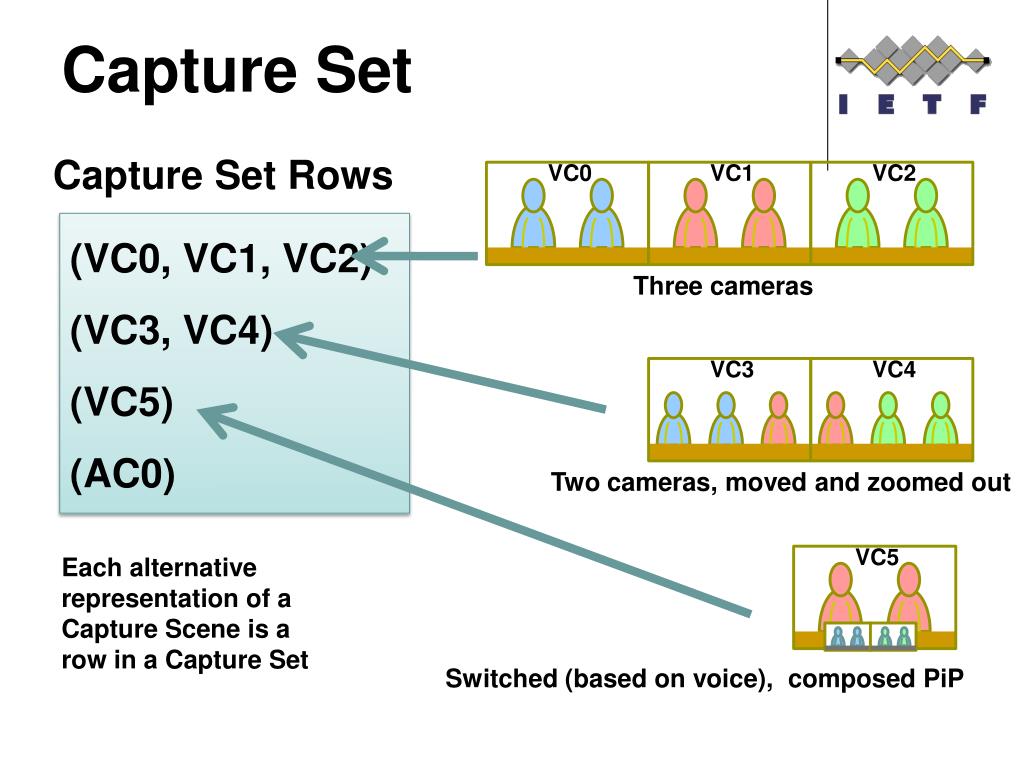 Capture Set Capture Set Rows VC0 VC1 VC2 (VC0, VC1, VC2) (VC3, VC4) (VC5) (AC0) Three cameras VC3 VC4 Two cameras, moved and zoomed out VC5 Each alternative representation of a Capture Scene is a row in a Capture Set Switched (based on voice), composed PiP