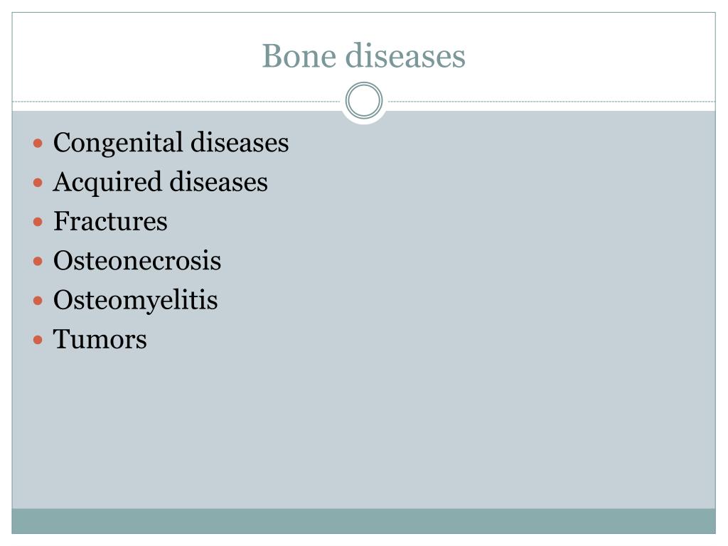Bone diseases Congenital diseases Acquired diseases Fractures Osteonecrosis Osteomyelitis Tumors