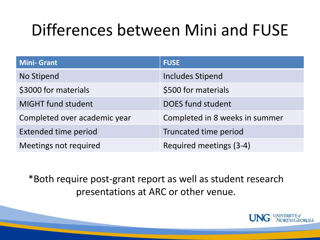 Differences between Mini and FUSE *Both require post-grant report as well as student research presentations at ARC or other venue.