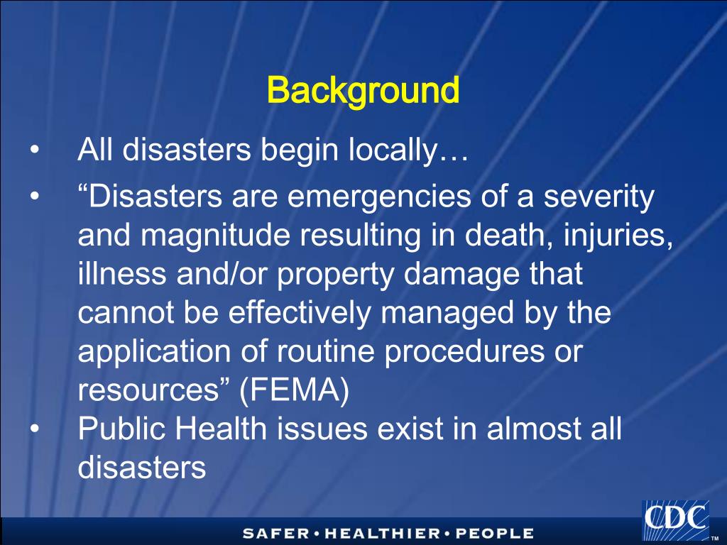 Background All disasters begin locally… “Disasters are emergencies of a severity and magnitude resulting in death, injuries, illness and/or property damage that cannot be effectively managed by the application of routine procedures or resources” (FEMA) Public Health issues exist in almost all disasters
