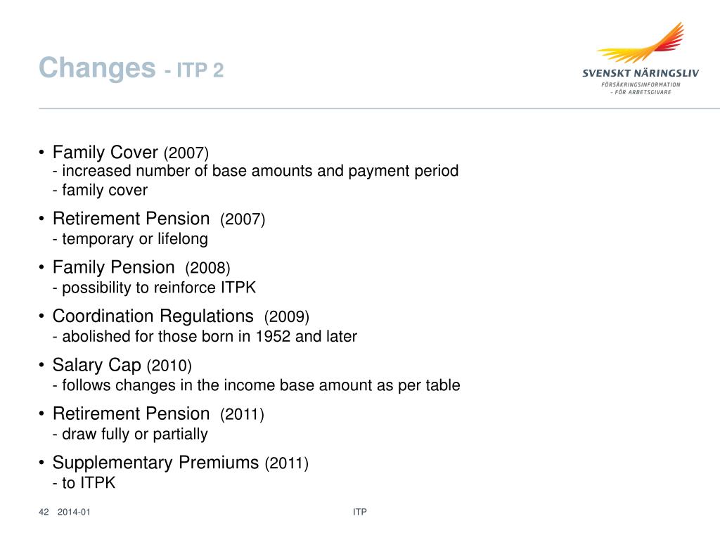 Changes -ITP 2 • Family Cover (2007)- increased number of base amounts and payment period - familycover • Retirement Pension (2007) - temporary or lifelong • FamilyPension (2008) - possibilitytoreinforce ITPK • CoordinationRegulations (2009) - abolished for those born in 1952 and later • SalaryCap (2010) - follows changes in the income base amount as per table • Retirement Pension (2011) - drawfully or partially • Supplementary Premiums (2011) - toITPK ITP