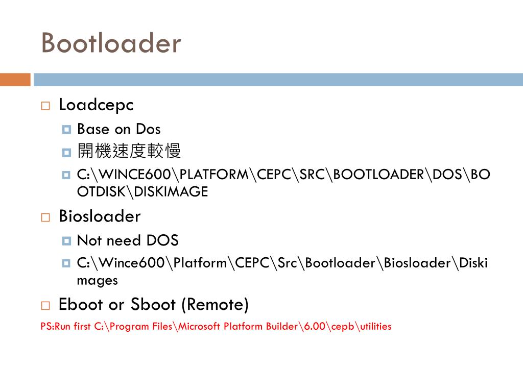 Bootloader • Loadcepc • Base on Dos • 開機速度較慢 • C:\WINCE600\PLATFORM\CEPC\SRC\BOOTLOADER\DOS\BOOTDISK\DISKIMAGE • Biosloader • Not need DOS • C:\Wince600\Platform\CEPC\Src\Bootloader\Biosloader\Diskimages • Eboot or Sboot (Remote) PS:Run first C:\Program Files\Microsoft Platform Builder\6.00\cepb\utilities