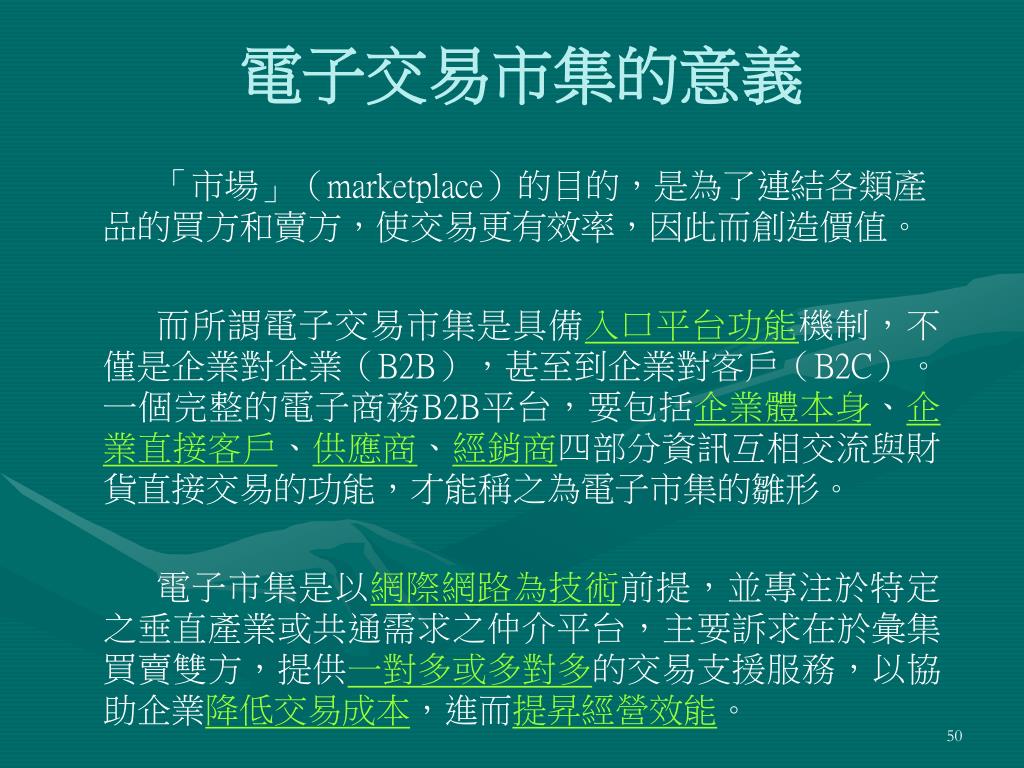 電子交易市集的意義 「市場」(marketplace)的目的,是為了連結各類產品的買方和賣方,使交易更有效率,因此而創造價值。 而所謂電子交易市集是具備入口平台功能機制,不僅是企業對企業(B2B),甚至到企業對客戶(B2C)。一個完整的電子商務B2B平台,要包括企業體本身、企業直接客戶、供應商、經銷商四部分資訊互相交流與財貨直接交易的功能,才能稱之為電子市集的雛形。 電子市集是以網際網路為技術前提,並專注於特定之垂直產業或共通需求之仲介平台,主要訴求在於彙集買賣雙方,提供一對多或多對多的交易支援服務,以協助企業降低交易成本,進而提昇經營效能。