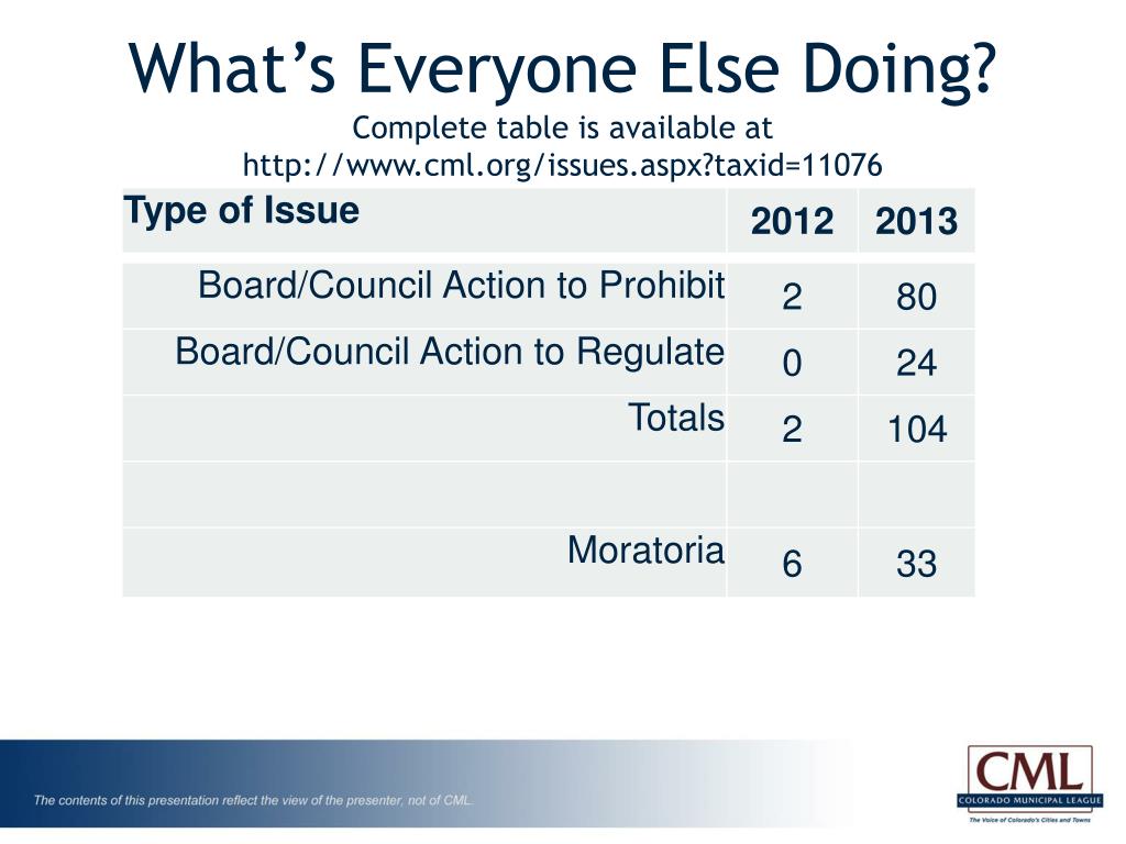 What’s Everyone Else Doing?Complete table is available at http://www.cml.org/issues.aspx?taxid=11076