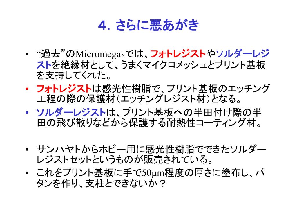 4.さらに悪あがき • “過去”のMicromegasでは、フォトレジストやソルダーレジストを絶縁材として、うまくマイクロメッシュとプリント基板を支持してくれた。 • フォトレジストは感光性樹脂で、プリント基板のエッチング工程の際の保護材(エッチングレジスト材)となる。 • ソルダーレジストは、プリント基板への半田付け際の半田の飛び散りなどから保護する耐熱性コーティング材。 • サンハヤトからホビー用に感光性樹脂でできたソルダーレジストセットというものが販売されている。 • これをプリント基板に手で50μm程度の厚さに塗布し、パタンを作り、支柱とできないか?