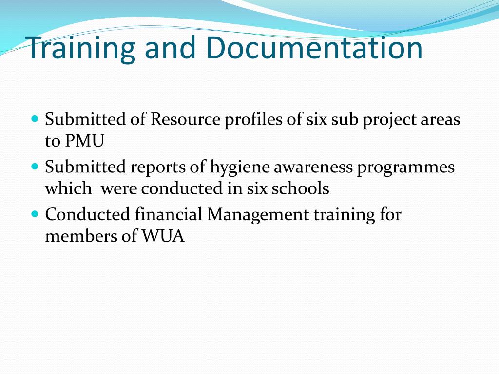 Training and Documentation • Submitted of Resource profiles of six sub project areas to PMU • Submitted reports of hygiene awareness programmes which were conducted in six schools • Conducted financial Management training for members of WUA
