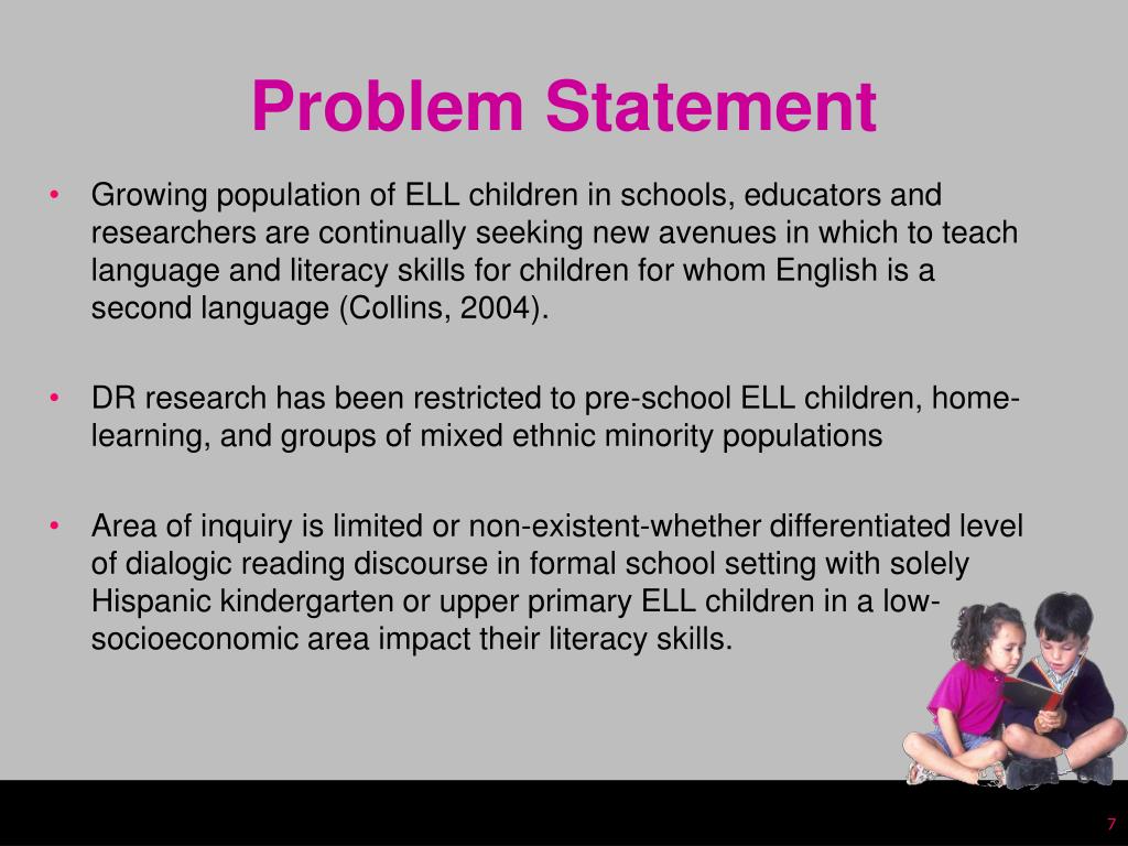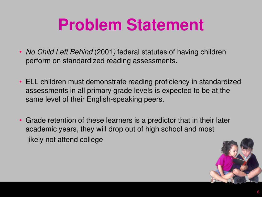 Problem Statement • No Child Left Behind (2001) federal statutes of having children perform on standardized reading assessments. • ELL children must demonstrate reading proficiency in standardized assessments in all primary grade levels is expected to be at the same level of their English-speaking peers. • Grade retention of these learners is a predictor that in their later academic years, they will drop out of high school and most likely not attend college