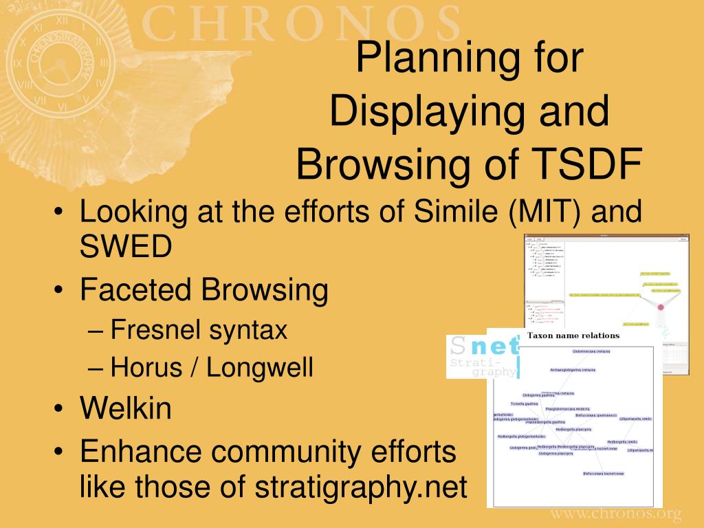Planning for Displaying and Browsing of TSDF • Looking at the efforts of Simile (MIT) and SWED • Faceted Browsing • Fresnel syntax • Horus / Longwell • Welkin • Enhance community effortslike those of stratigraphy.net www.chronos.org