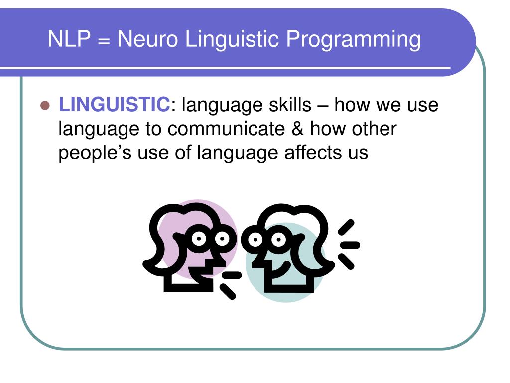 NLP = Neuro Linguistic Programming • LINGUISTIC: language skills – how we use language to communicate & how other people’s use of language affects us