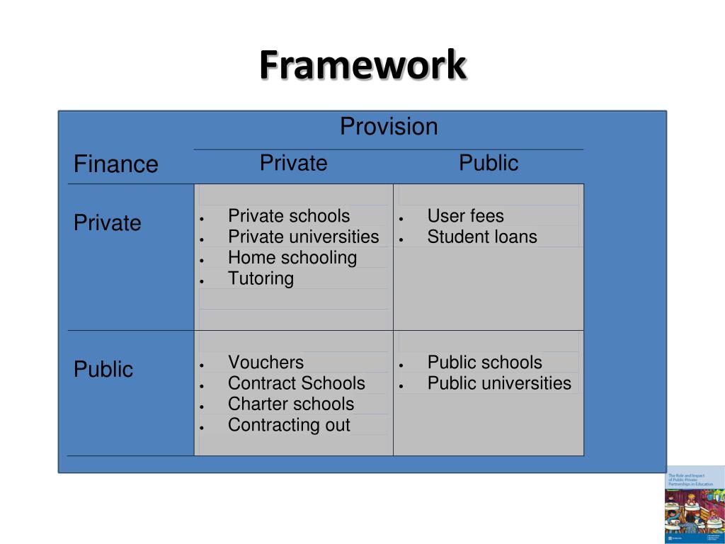 PPP Continuum Low PPP High PPP Integral Moderate Lacks Nascent Emerging Engaged Vouchers, Loans, Scholarships. Funding follows student. Public provides, finances, regulates education services Private schools Subsidies to private schools Contracts with private schools to provide a portion of education. Private Management of public schools 100% Public 100% Private