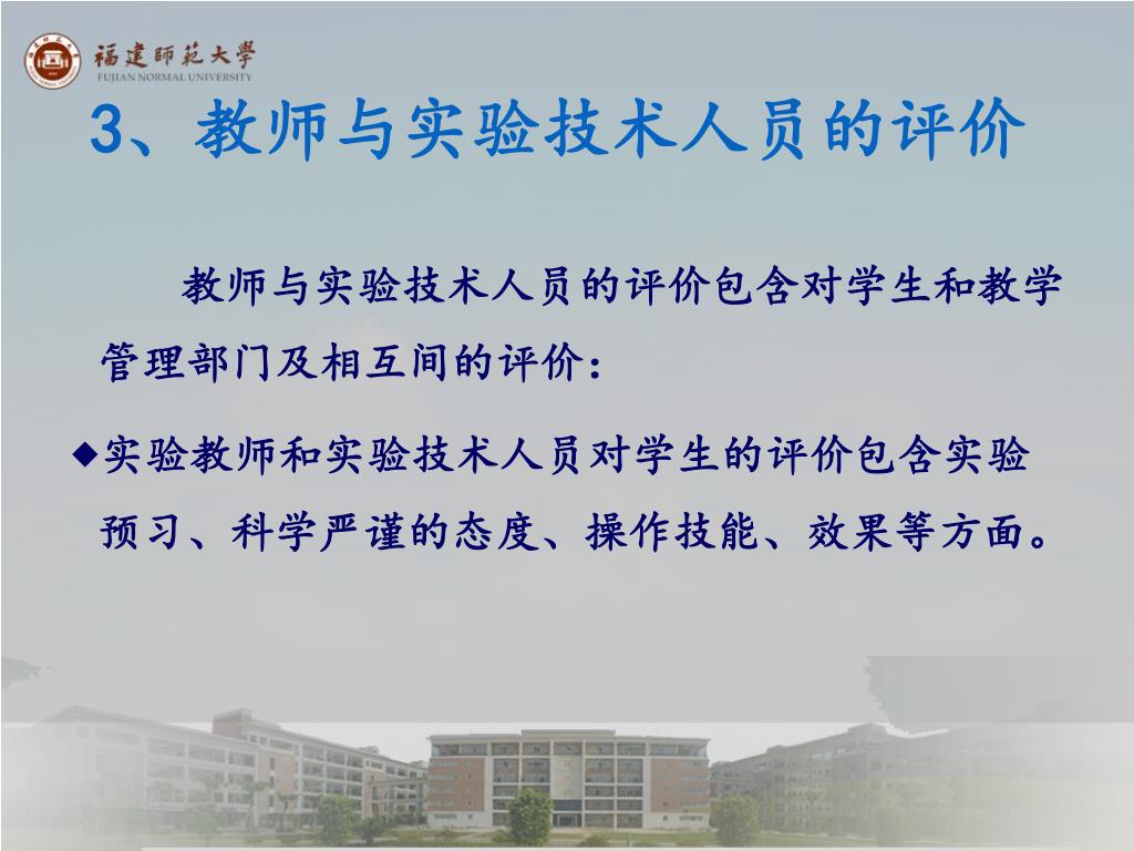3、教师与实验技术人员的评价 教师与实验技术人员的评价包含对学生和教学管理部门及相互间的评价: 实验教师和实验技术人员对学生的评价包含实验预习、科学严谨的态度、操作技能、效果等方面。