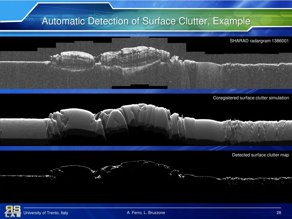 AutomaticDetection of SurfaceClutter, Example SHARAD radargram 1386001 Coregistered surface clutter simulation Detected surface clutter map A. Ferro, L. Bruzzone