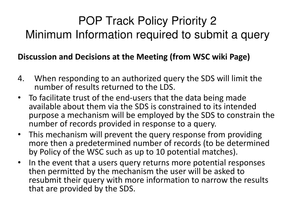 POP Track Policy Priority 2Minimum Information required to submit a query Discussion and Decisions at the Meeting (from WSC wiki Page) • When responding to an authorized query the SDS will limit the number of results returned to the LDS. • To facilitate trust of the end-users that the data being made available about them via the SDS is constrained to its intended purpose a mechanism will be employed by the SDS to constrain the number of records provided in response to a query. • This mechanism will prevent the query response from providing more then a predetermined number of records (to be determined by Policy of the WSC such as up to 10 potential matches). • In the event that a users query returns more potential responses then permitted by the mechanism the user will be asked to resubmit their query with more information to narrow the results that are provided by the SDS.