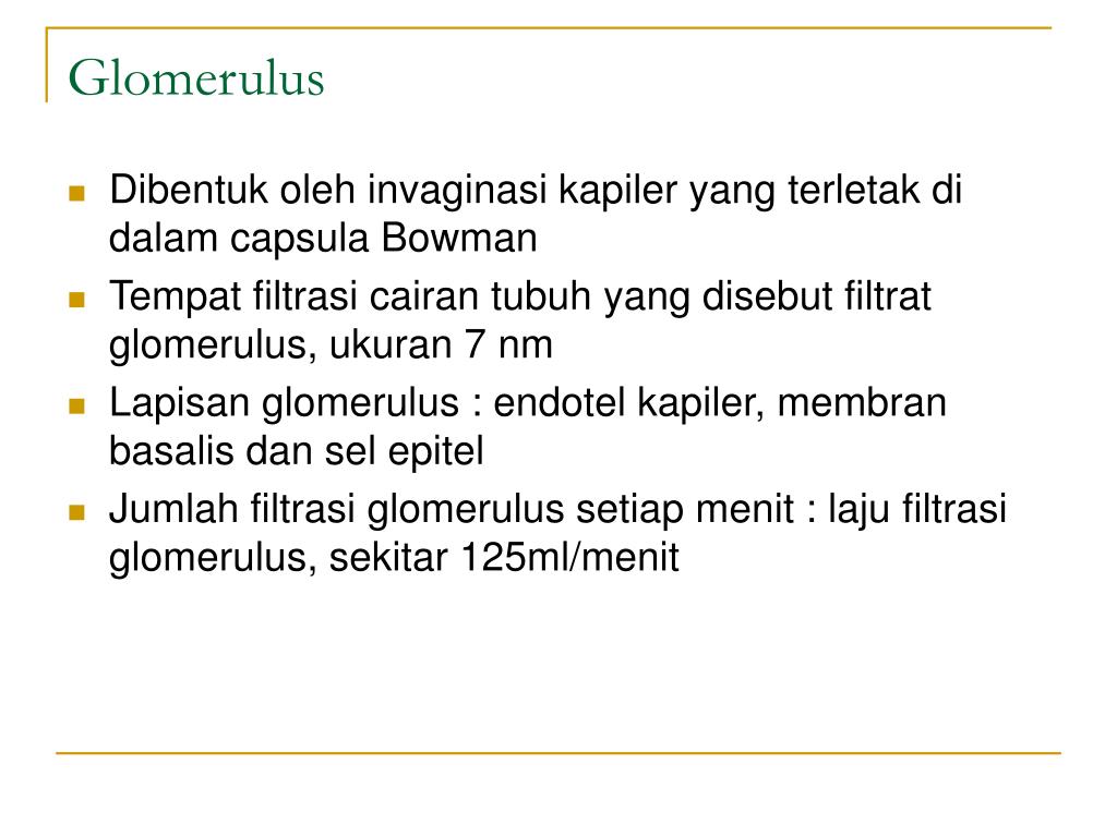 Glomerulus • Dibentuk oleh invaginasi kapiler yang terletak di dalam capsula Bowman • Tempat filtrasi cairan tubuh yang disebut filtrat glomerulus, ukuran 7 nm • Lapisan glomerulus : endotel kapiler, membran basalis dan sel epitel • Jumlah filtrasi glomerulus setiap menit : laju filtrasi glomerulus, sekitar 125ml/menit