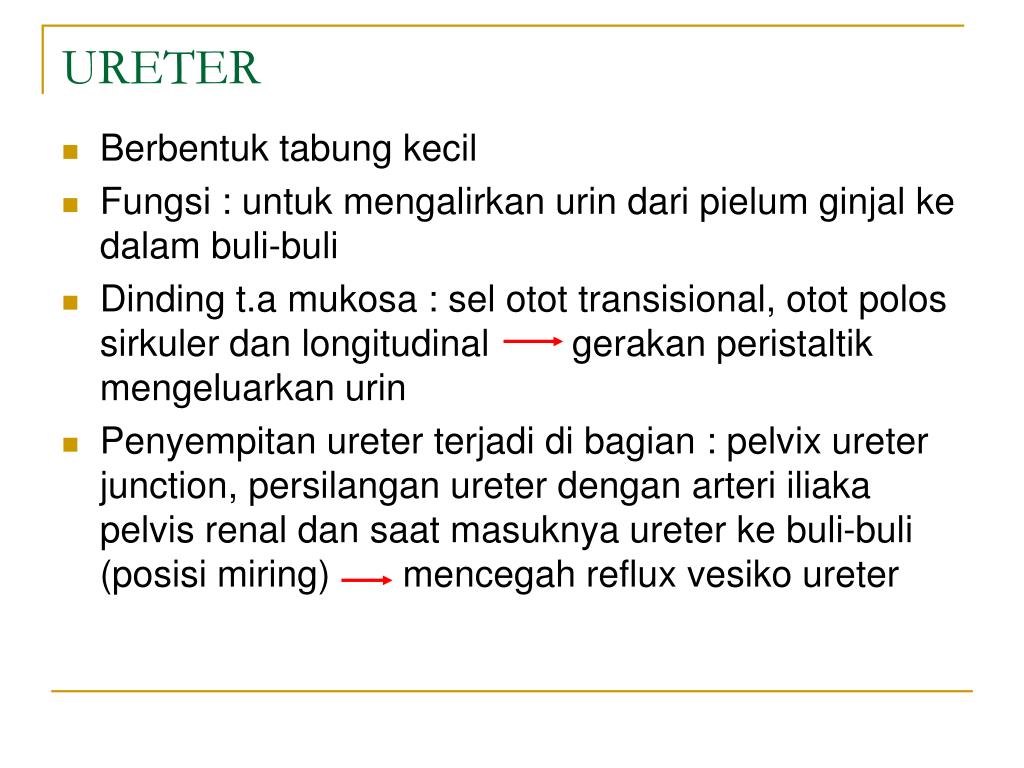 URETER • Berbentuk tabung kecil • Fungsi : untuk mengalirkan urin dari pielum ginjal ke dalam buli-buli • Dinding t.a mukosa : sel otot transisional, otot polos sirkuler dan longitudinal gerakan peristaltik mengeluarkan urin • Penyempitan ureter terjadi di bagian : pelvix ureter junction, persilangan ureter dengan arteri iliaka pelvis renal dan saat masuknya ureter ke buli-buli (posisi miring) mencegah reflux vesiko ureter