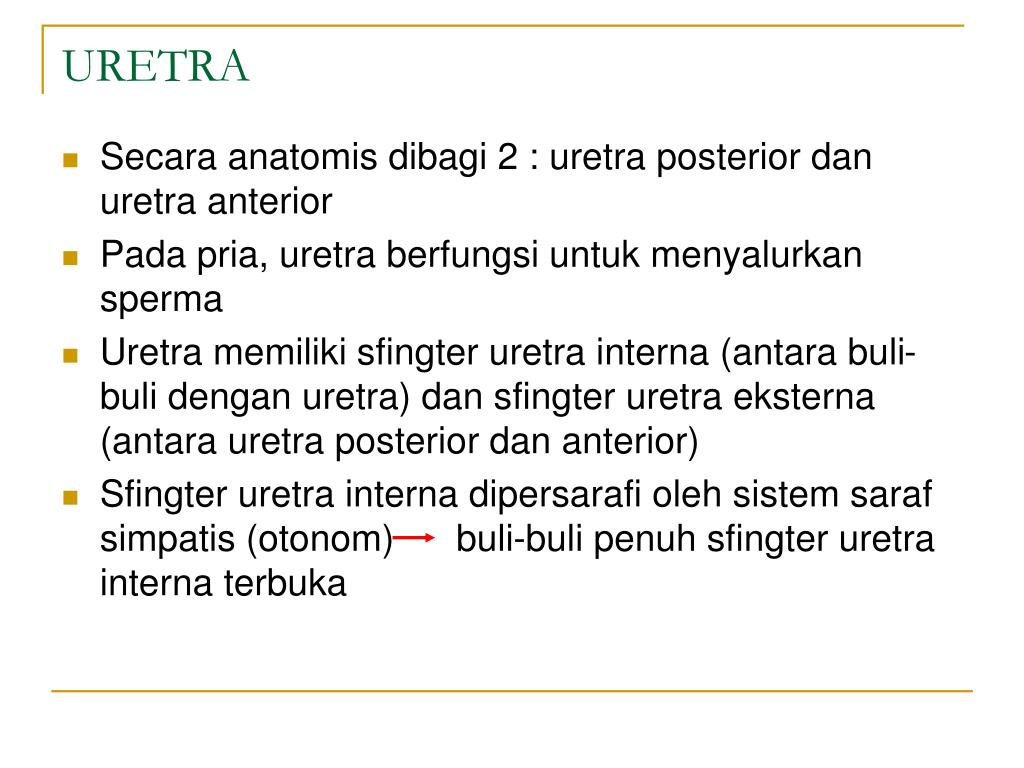URETRA • Secara anatomis dibagi 2 : uretra posterior dan uretra anterior • Pada pria, uretra berfungsi untuk menyalurkan sperma • Uretra memiliki sfingter uretra interna (antara buli-buli dengan uretra) dan sfingter uretra eksterna (antara uretra posterior dan anterior) • Sfingter uretra interna dipersarafi oleh sistem saraf simpatis (otonom) buli-buli penuh sfingter uretra interna terbuka