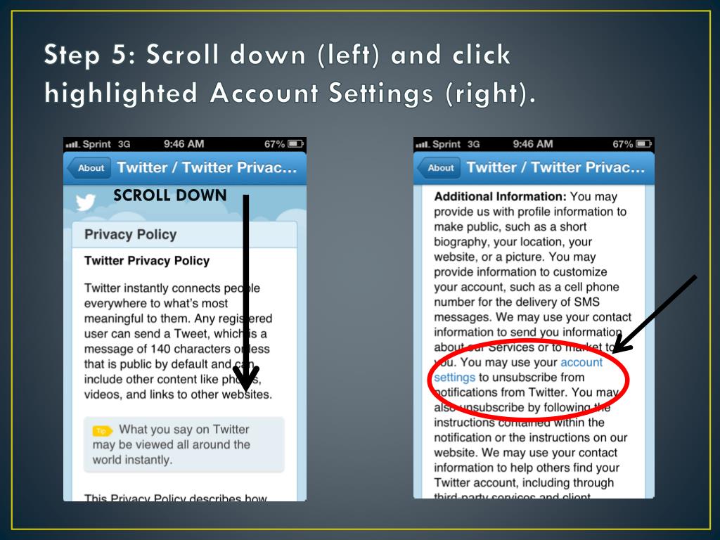 Step 5: Scroll down (left) and click highlighted Account Settings (right). SCROLL DOWN