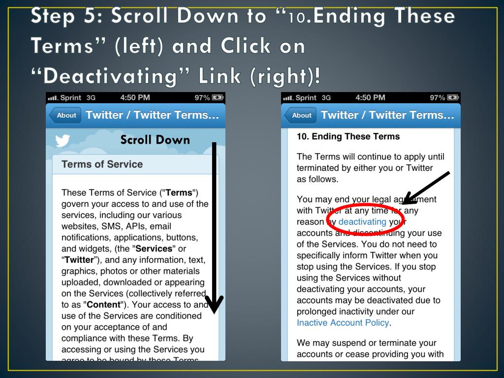Step 5: Scroll Down to “10.Ending These Terms” (left) and Click on “Deactivating” Link(right)! Scroll Down